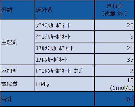 採取した電解液については、現地で添加剤を含めた高精度な組成分析(表1)を実施します。