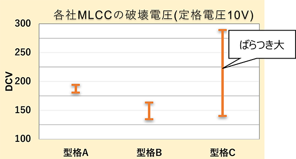 - セラミックコンデンサの破壊電圧評価による耐圧マージン確認