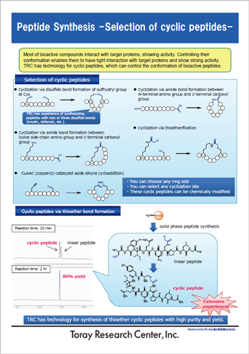 We provide not only analysis services but peptide synthesis services to help our customers to advance drug discovery and development.We can make fast and efficient production of non-standard peptides including cyclic peptides as well as peptides difficult to synthesize.We also offer you a variety of services (structural analysis, characterization, etc.). Please try our one-stop service.