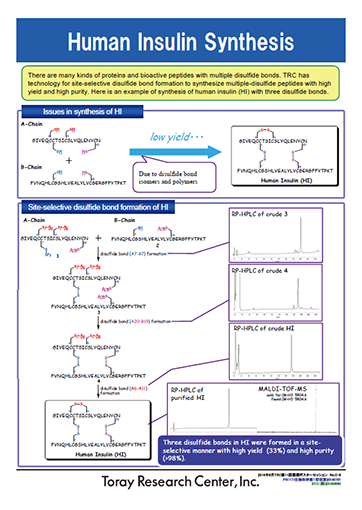 There are many kinds of proteins and bioactive peptides with multiple disulfide bonds. We have technology for site-selective disulfide bond formation to synthesize multiple-disulfide peptides with high yield and high purity. Here is an example of synthesis of human insulin (HI) with three disulfide bonds.