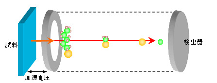 パルス化された一次イオンの照射で発生した二次イオンは一定のエネルギーで加速され、質量に応じた速度で(軽いイオンは高速、重いイオンは低速)質量分析計に入る。検出器に到達するまでの時間(飛行時間)は質量の関数であり、この飛行時間の分布を精密に計測することによって質量スペクトルが得られる。