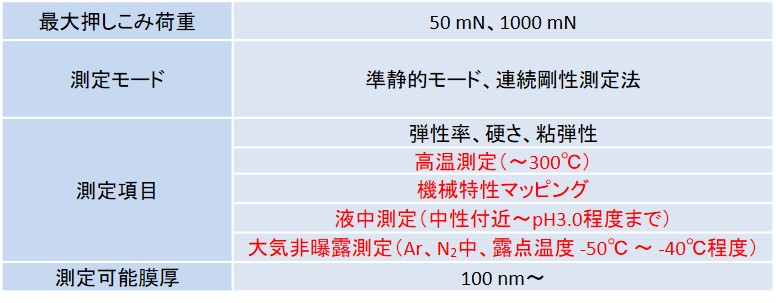 高性能ナノインデンテーション装置を導入しました。本装置は、薄膜または微小試料の機械特性を測定する装置です。従来の薄膜・微小部測定に加え、①高温測定、②大気非暴露測定、③高速機械特性マッピング(2次元、3次元)、④水中測定、などの機能を有しています。既設の高空間分解能ナノインデンテーション装置と合わせ、薄膜・フィルム・部材表面の力学・粘弾性特性評価、積層材料や表層改質材料の断面解析、ブレンドポリマーの相分離解析等に幅広く活用できますので、是非お声がけください。